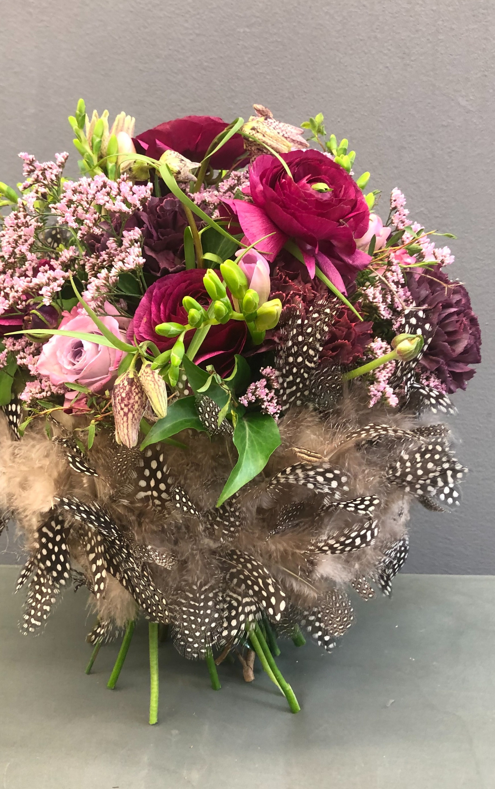 Mit Federn gestalten wir eine Manchette, in welche wir im Anschluss mit frischen Frühlingsblüher einen kleinen aber feinen Strauss gestalten.