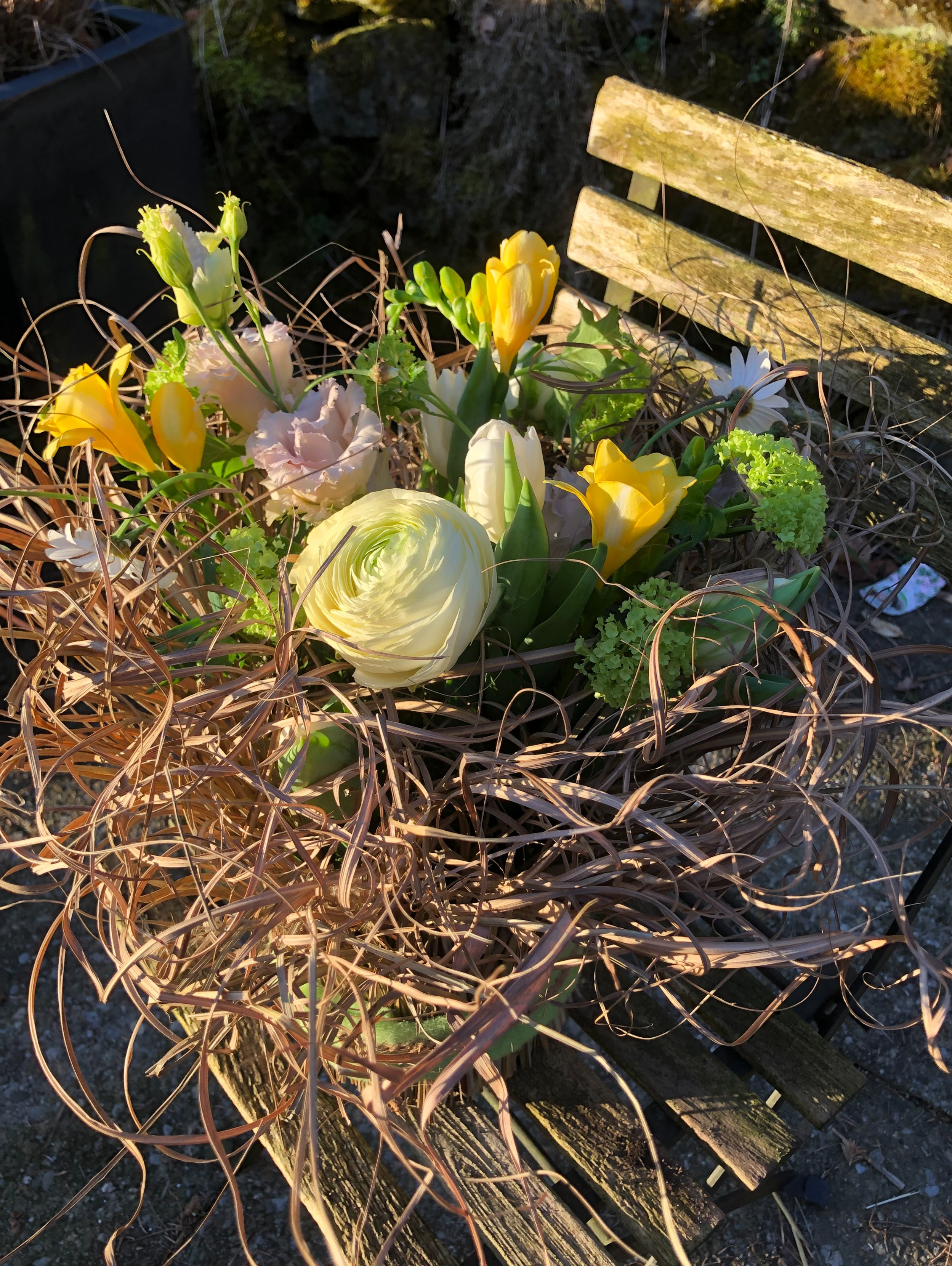 Mit wilden, trockenen Gräsern ummanteln wir ein Gefäss, welches im Anschluss mit frischen Blumen bestückt wird. Das dekorative Grasgefäss kann immer wieder neu befüllt werden.