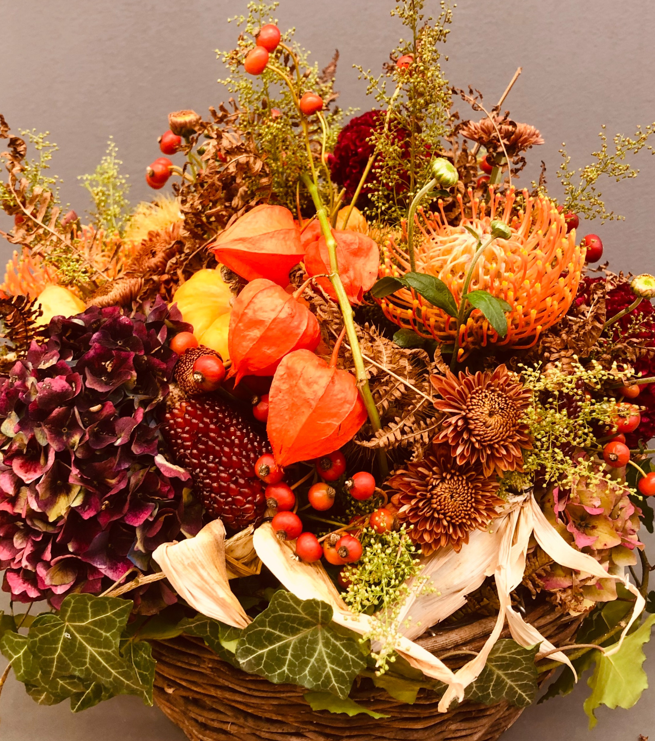 Im Herbst wird geerntet und gesammelt und genau das tun wir auch. Wir sammeln in einem Korb alles was der Herbst uns zu bieten hat. Kürbis, Mais, Kastanien, aber auch Schnittblumen, Hagebutten und Laub in allen wunderbaren Farben des Herbstes.